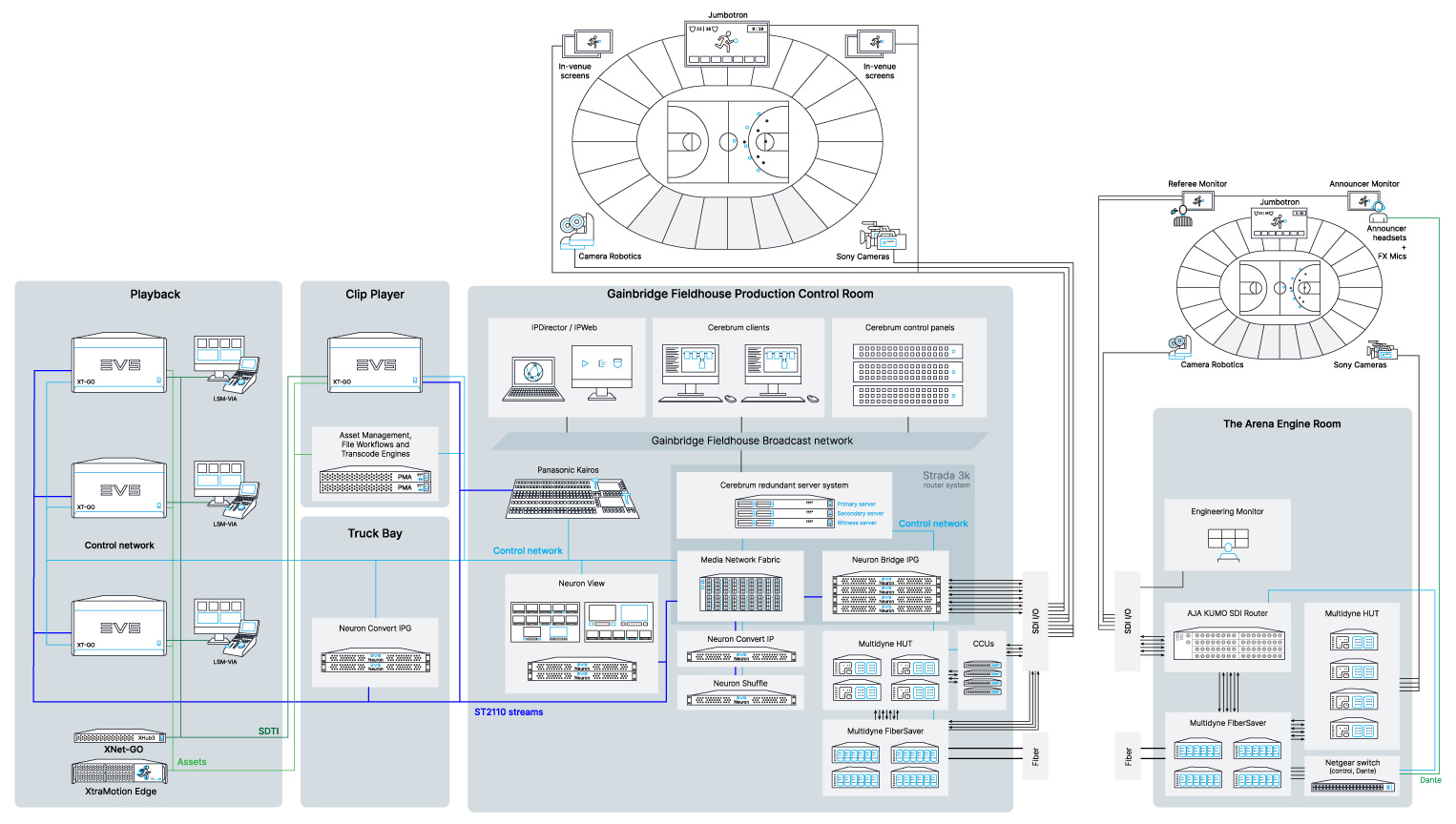 Within this architecture, EVS Neuron serves as the IP gateway and processing layer, bridging SDI and IP domains, and converting signals as needed.