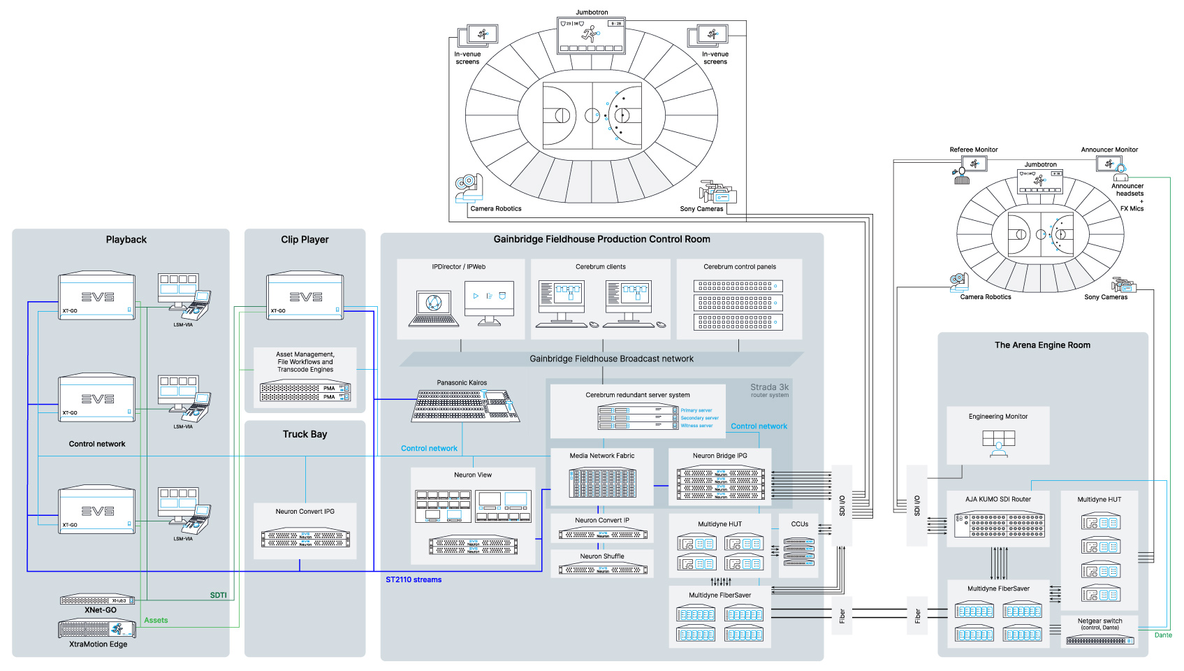 Within this architecture, EVS Neuron serves as the IP gateway and processing layer, bridging SDI and IP domains, and converting signals as needed.